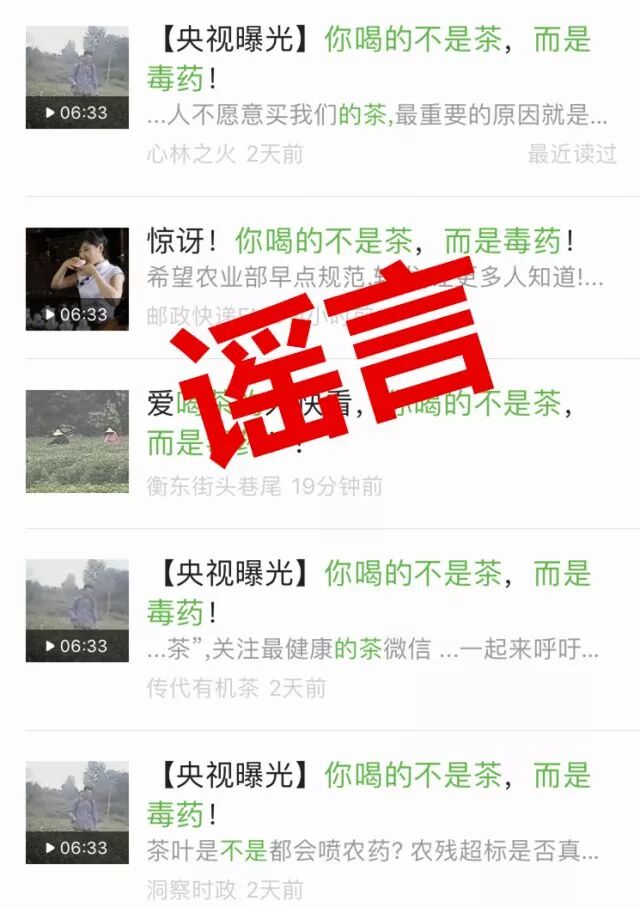 然而,近日一篇《【央视曝光】你喝的不是茶,而是毒药!》为标题的文章在平台广泛传播,这给爱喝茶人士的心里添了不少堵~~谣言文章称外国人不愿意买我们的茶,最重要的原因就是农药残留问题。文章详细叙述了央视记者与茶农的对话,称我国98%茶树都喷农药,茶农都不敢喝自己种的茶。另外,文章还列举了9家知名的茶叶均含有至少3种农药残留。此外,某品牌绿茶、茉莉花茶和铁观音样本均含有农业部明令禁止在茶树上使用的高毒农药灭多威……