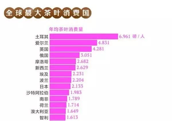 9. 人均每年喝掉茶最多的是中国?答案:不是,连前三都排不上!英国人民每天约喝掉1.65亿杯茶,换算成年的话就是每年喝掉620亿杯。世界上最大的茶叶消费国是中国,但若平均到每人头上,情况就会有所不同——根据2015年的统计数据,土耳其、爱尔兰和英国是人均茶消费最多的三个国家。