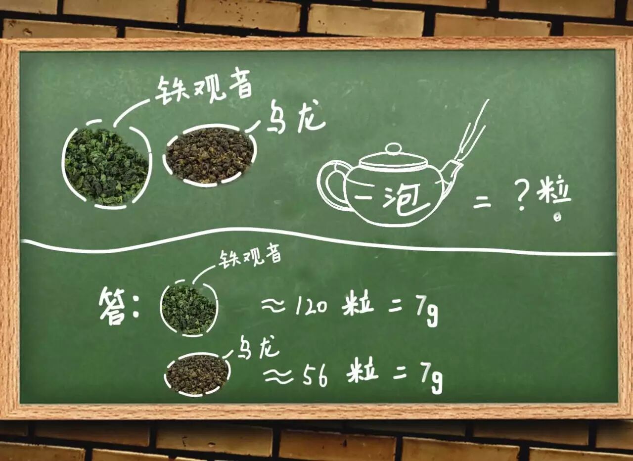 4. 如果泡一泡茶,没有秤怎么办?(以铁观音和阿里山高山乌龙为例)答案:没关系,茶语网帮您数了,一般的铁观音一泡平均约120粒(7g),阿里山高山乌龙一泡平均约56粒(7g)。