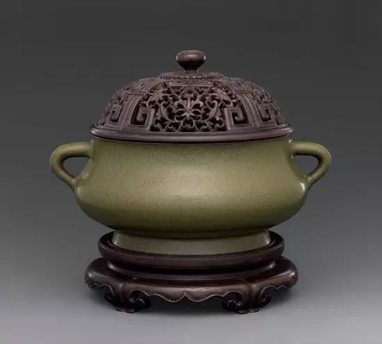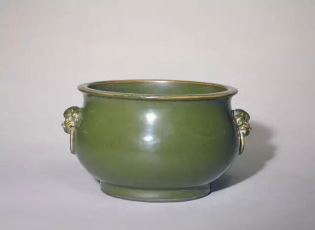 故宫博物院藏 清咸丰茶叶末釉铺首耳炉,高13cm,口径19.8cm,足径13.5cm。炉撇口,鼓腹,圈足。腹上部置对称铺首耳。通体施茶叶末釉。外底署金彩篆书“大清咸丰年制”三行六字款。