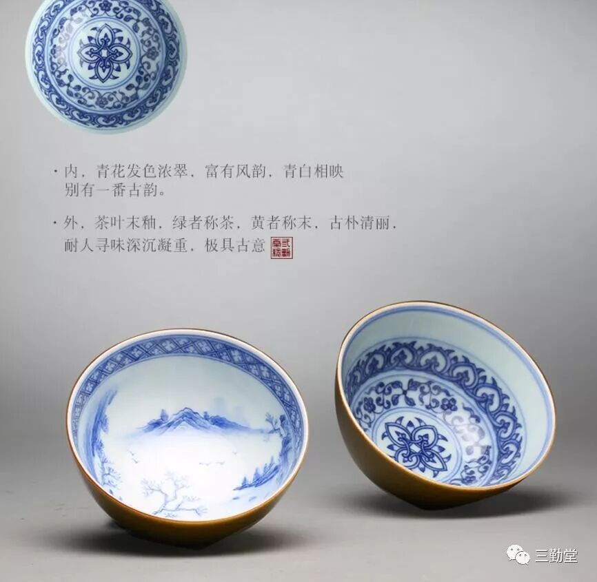 此款品茗杯集青花与茶叶末釉于一身,清丽风韵,古意悠悠。