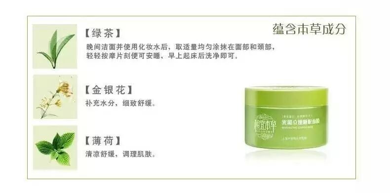 绿茶精华可轻受损肌肤的压力,排出毛孔中的不良物质,恢复肌肤健康净白促进肌肤表皮细胞生长,发挥舒缓修护作用。