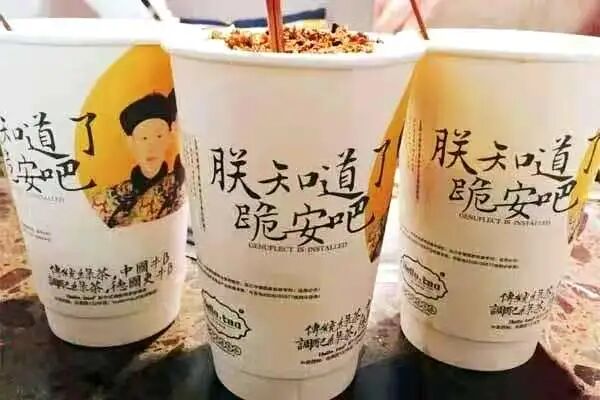 茶颜悦色茶颜悦色的纸杯有着鲜明的文化气息和设计感。不同的时节,不同的奶茶,纸杯的图案都不一样,如“桂花弄”纸杯,背景是古代宣纸上几个顽童无忧无虑地赛着滚铁环,一枝桂花上绿叶散漫地摇曳着,小巧玲珑的桂花点缀其间,画作旁边还有一首文艺的小诗,告诉我们“桂花弄”的来历——作者童年记忆里的桂花;“人间烟火”纸杯,画面是层层山峦上,万千鲜红的孔明灯星星点点地闪耀,一个女子浅浅微笑,许下美好愿望,在漆黑深夜中显得格外温暖!而我认为最有趣的纸杯图案是三个皇帝或者皇后呈三角形站位的那幅,配合的文字是“朕/本宫知道了,跪安吧”,融合了古代和现代的流行语句,让人忍俊不禁。设计者的别具匠心让你觉得:茶颜悦色最中国!