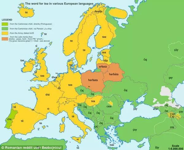 可以看到除了葡萄牙之外基本都是说tea,这就是当年荷兰和西班牙的功劳。别看葡萄牙就一小块,前葡萄牙殖民地(西非啊,南美洲一些地方)都是说chai的。而东欧国家的读音就是受俄罗斯那边更早的陆路贸易的影响了。不过现在在美国,有些人(商家)试图把chai转型为“加奶加糖/蜂蜜的红茶”,把tea的范围缩小为“用叶子泡出来的茶”。