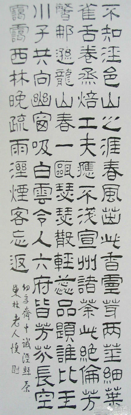 汪巢林的隶书以汉碑为宗,《幼孚斋中试泾县茶》条幅,可谓是其隶书中的一件精品。值得一提的是,条幅上所押白文“左盲生”一印,说明此书作于他左眼失明以后。这首七言长诗,通篇气韵生动,笔致动静相宜,方圆合度,结构精到,茂密而不失空灵,整饬而暗相呼应。该诗是汪士慎在管希宁(号幼孚)的斋室中品试泾县茶时所作。