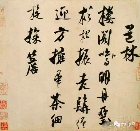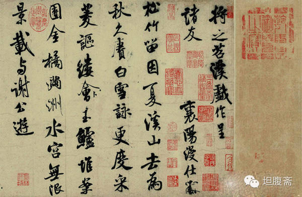 米芾自书诗帖,诗曰: “楼阁明丹垩,杉松振老髯,僧迎方拥帚,茶细旋探檐。”诗中描写的是:在郁郁葱葱的松林之中,有一座寺院,僧人一见客人到来,便“拥帚”、置茗相迎接。“拥帚”亦称“拥慧”,扫地之意。古人迎候尊贵,惟恐尘埃触及客人,常拥帚以示敬意。“茶细旋探檐”,意为从屋檐上挂着的茶笼中取出细美的茶叶。“探檐”一词,生动地表现了寺院僧人以茶请客的同时,也记录了宋代茶叶贮存的特定方式。