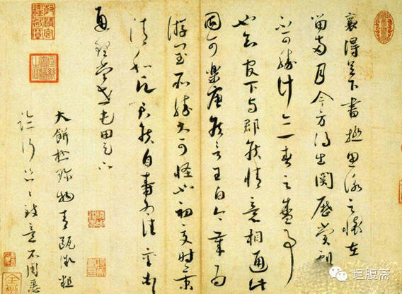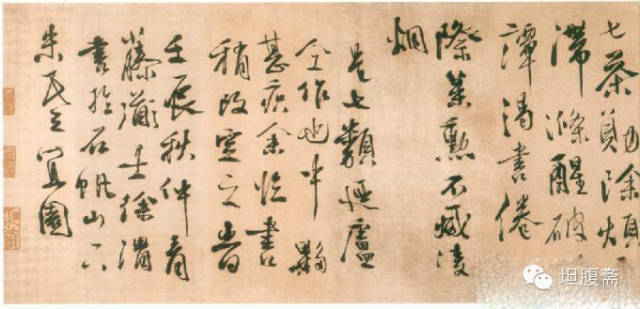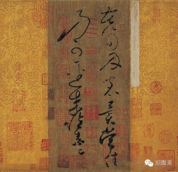 “苦笋及茗异常佳,乃可径来,怀素上”。《苦笋帖》,绢本,长25.1厘米,宽12厘米,字径约3.3厘米左右,清时曾珍藏于内府, 现藏上海博物馆。