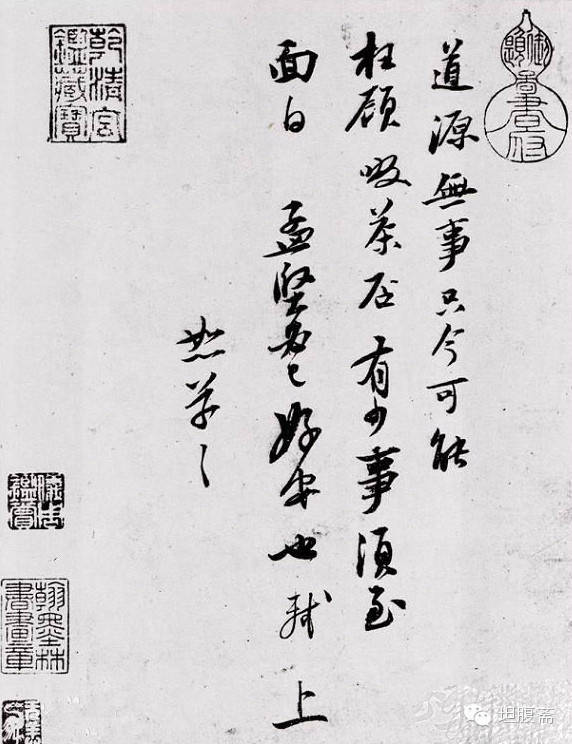 《啜茶帖》,也称《致道源帖》,是苏轼于元丰三年(1080)写给道源的一则便札,22字,纵分4行。《墨缘汇观》、《三希堂法帖》著录。其书用墨丰赡而骨力洞达,所谓“无意于嘉而嘉”于此可见一斑。此帖为纸本,纵23.4厘米,横18.1厘米,现藏故宫博物院。
