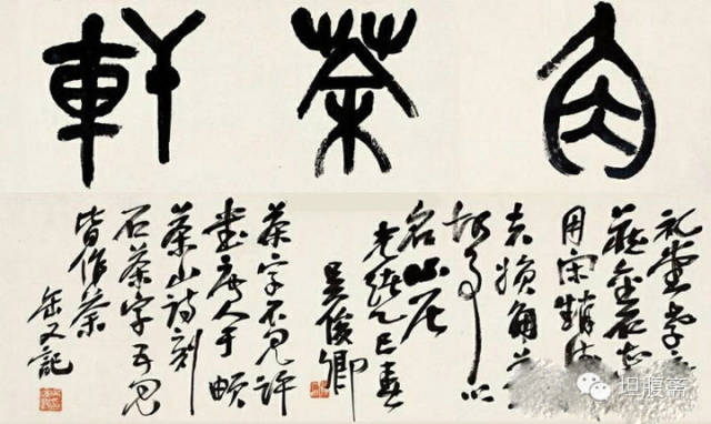 “角茶轩”,篆书横披,1905年书,大概是应友人之请所书的。这三字,是典型的吴氏风格,其笔法、气势源自于石鼓文。其落款很长,以行草书之,其中对“角茶”的典故、“茶”字的字形作了记述:“礼堂孝谦藏金石甚富,用宋赵德父夫妇角茶趣事以名山居。…茶字不见许书,唐人于 茶山诗刻石,茶字五见皆作荼…”
