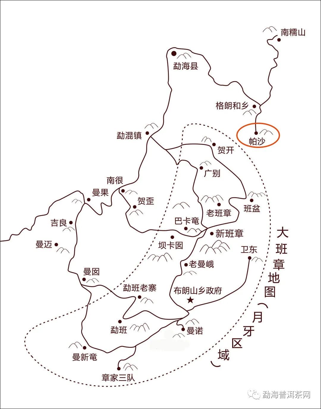 帕沙古茶山的最高海拔为1850米,平均海拔在1700多米,从地理位置上看,处于南糯山与布朗山之间,据说130多年前,现今的班章老寨就是帕沙村民的祖先去开发并世代安居乐业的。帕沙五寨中,最先出名的是帕沙老寨,由老寨分出的新寨和中寨,距离老寨最近,间距不到1千米,这3个寨子的海拔在1750m左右。这个数字是不是很熟悉,冰岛老班章也是这个海拔呀!