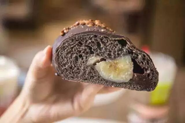 香蕉巧克力的甜度刚刚好,内陷是黑色的巧克力酱,融合了相机哦啊,所以香味十足,表层还有点缀的酸酸甜甜的葡萄干,不是很惊艳,但是也还好吃,可以平尝一尝。
