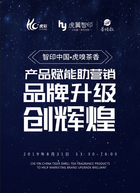 2019年8月31日,虎彩印艺将联合茶情报共同举办虎彩印艺2019“智印中国·虎嗅茶香--产品赋能助营销 品牌升级创辉煌”专题会。