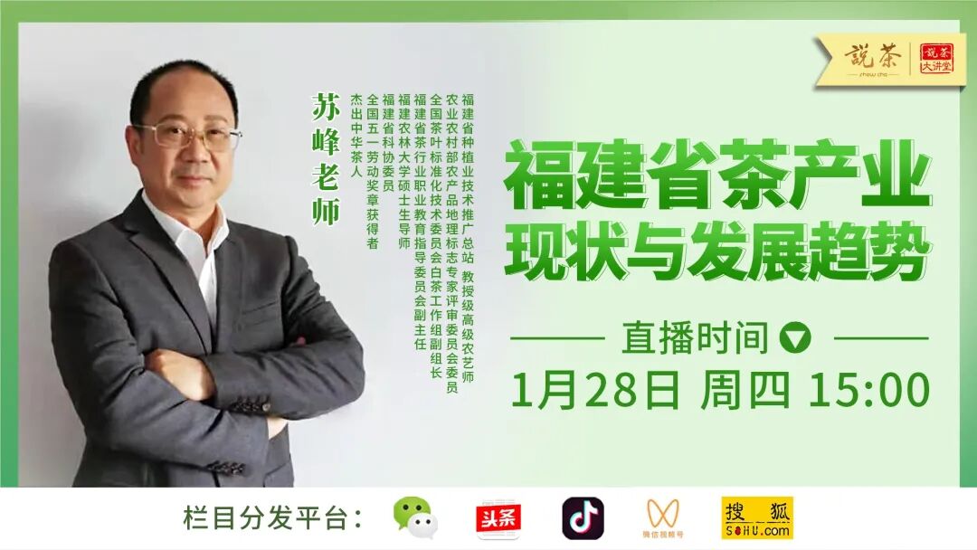 1月28日, 杰出中华茶人、全国五一劳动奖章获得者、福建省种植业技术推广总站教授级高级农艺师苏峰走进说茶直播间,作《福建省茶产业发展现状与趋势》公益讲座,从“民生产业概述”“福建茶产业现状”“福建茶产业发展趋势”“十四·五 福建茶产业发展思路”等4大方面,与大家进行分享交流,并提出了建设性的建议。