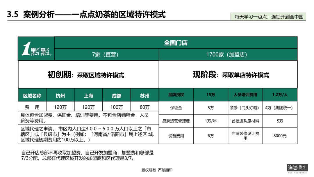 案例三:一点点奶茶的区域加盟模式在上个世纪九十年代。当时在台湾它的名字叫50岚奶茶,品牌进入内地运作,之后有了一个非常好听的名字,那就是一点点。在上海成立内地的总部是2011年,自从那以后就有不少人知知道了一点点奶茶的名气,在内地的人气可以看出这是一个非常有潜力的品牌。先看看一点点奶茶的目前基本门店情况:7家直营+1700家加盟店。我们且把它分为两个阶段:初创期和现阶段一点点的初创期一点点采取的是区域特许加盟模式,现在一点点奶茶采取单店加盟模式。例如它前期的区域加盟模式:区域开放地区以及代理费用有杭州(120万)、上海(120万)、成都(100万)、苏州(80万),其中加盟代理费用包括:加盟费、保证金、培训等费用,不包含店铺租金,人员薪酬等费用。区域代理之申请,市区内人口达30 0~500万人口以上之「市辖区」或「县级市」为主,例如:「河南省/洛阳市」属上述区域、区域代理初期费用约100万以上。其中需要注意的是,成为区域代理加盟商后,自己开店总部不再收取加盟费,但是自己开发加盟商,加盟费和总部是7/3分配。总部在代理区域开发的加盟商和区代理是3/7。一点点的现阶段现在它转为单店加盟模式,加盟费用组成如下:品牌授权费用:15万人员培训费用:1.2万/人保证金费用:5万装修(门头灯箱):4万品牌运营管理费:1万/年首批进购票材料:5万设备费用:6万店铺装修设计费用:8000元