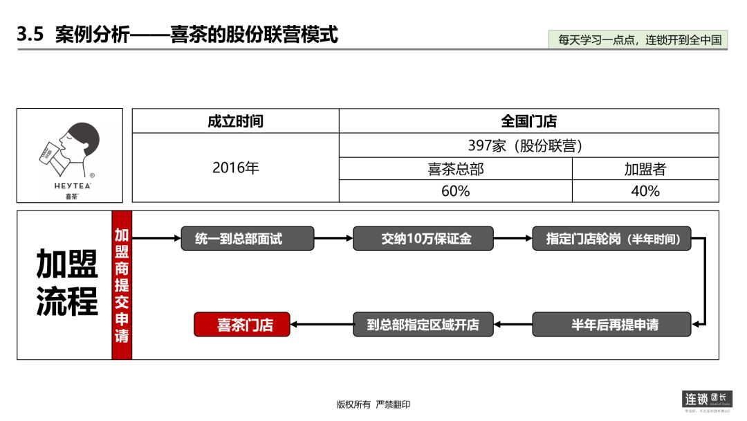 案例二:喜茶的股份联营模式喜茶成立于2016年,全国门店一共397家,模式设计是采取股份联营,即喜茶总部是占比60%,加盟商是占比40%。