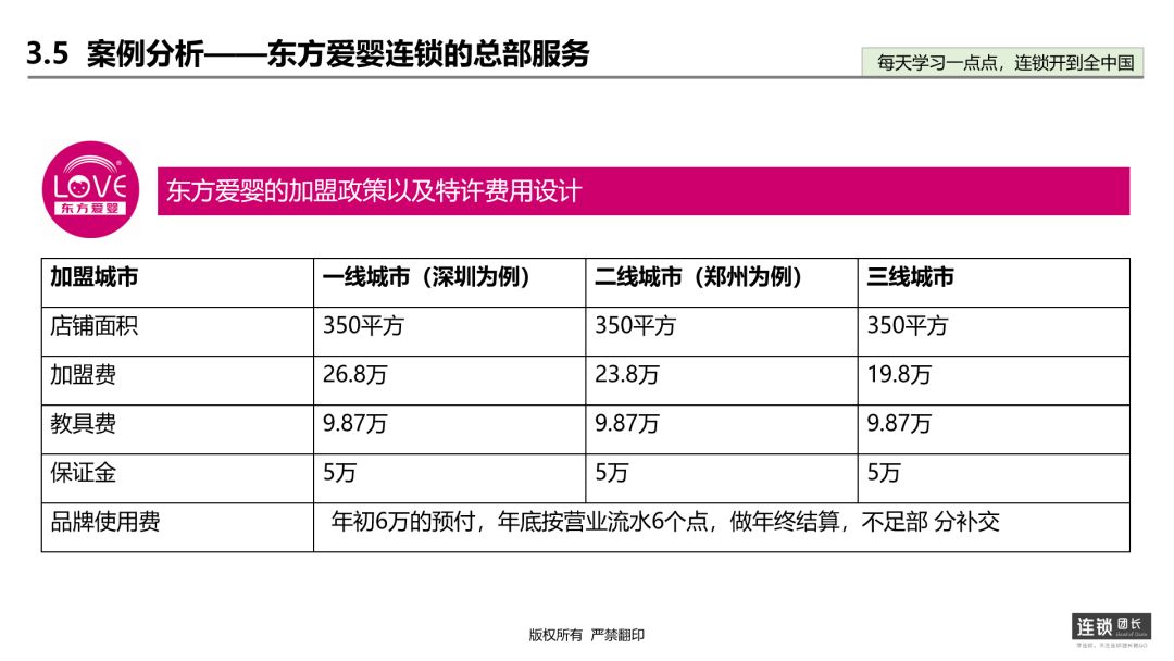 其中加盟商加盟后,提出了加盟全程帮扶政策,关键的课程,总部输出专业的老师进行授课,持续12周,共84天的长时间陪跑。东方爱婴连锁把从加盟到开店划分三个阶段:筹划期、筹建期、开业督导期。筹划期间:主要集中在第一周和第二周,为加盟商提供门店运营的策划和商务事务的指导。筹建期间:提供拓展经理进行为加盟商选址指导,从第3到第8周开始,一直提供设计和装修的指导,把加盟商省钱省事省时。第9周和第10周,开始教具设备采购。其中从第4周开始做团队建设的指导、定价方案,开业方案设计,以及最后输出员工的培训。开业督导期:督导期就是开业完毕之后,还有后续总部的督导,为的就是把东方爱婴的标准化贯彻,以及平常的营销推广指导。其次东方爱婴的加盟政策和加盟费用设计如下: