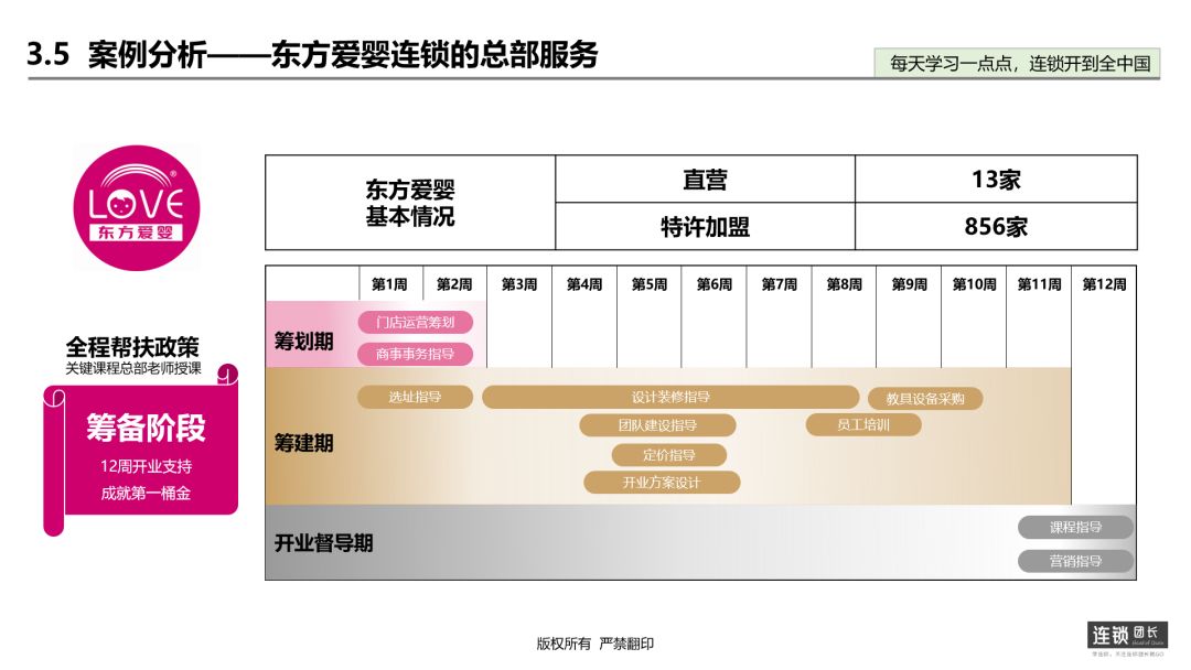 案例一:东方爱婴先看一下它的发展历程:目前直营门店:13家特许加盟门店:856家东方爱婴是国内率先提出 0-3 岁早期教育细分市场这一概念的教育机构,是中国早期 教育的先行者。 东方爱婴创立婴幼儿 3 个月分龄和混龄的早期教育模式,研发出适合中国 0-3 岁婴幼儿的 6 阶段、9 大类、31 门互动早教课程和针对 0-36 个月婴幼儿每月成长教育需要的抱抱熊家庭互动早教产品体系。我们在看看东方爱婴连锁的总部的职能设计,即为加盟商提供什么服务。