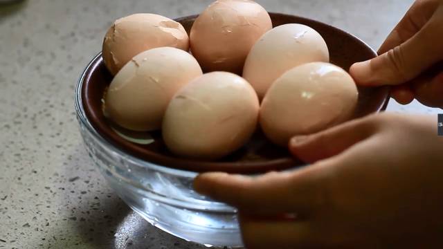 2.鸡蛋捞出后用凉水冲泡,接着用擀面杖把表面的皮敲碎,也可以直接用手磕碎,但不要揭开鸡蛋皮。