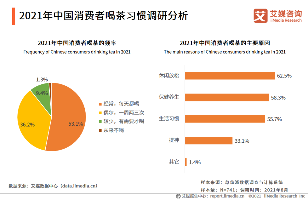 iiMedia Research(艾媒咨询)数据显示,2021年超过九成的中国消费者有喝茶的经历,保持每天喝茶习惯的消费者占53.1%,在喝茶的主要原因上,为了休闲放松的消费者占比最高,达到62.5%,保健养生、生活习惯跟随其后。艾媒咨询分析师认为,饮茶文化从古流传至今,国人饮茶已成为一种普遍现象,随着当代人养生、娱乐的健康以及精神需求不断上升,饮茶的愉悦身心、滋养身体等益处,让更多的人关注并选择饮茶。