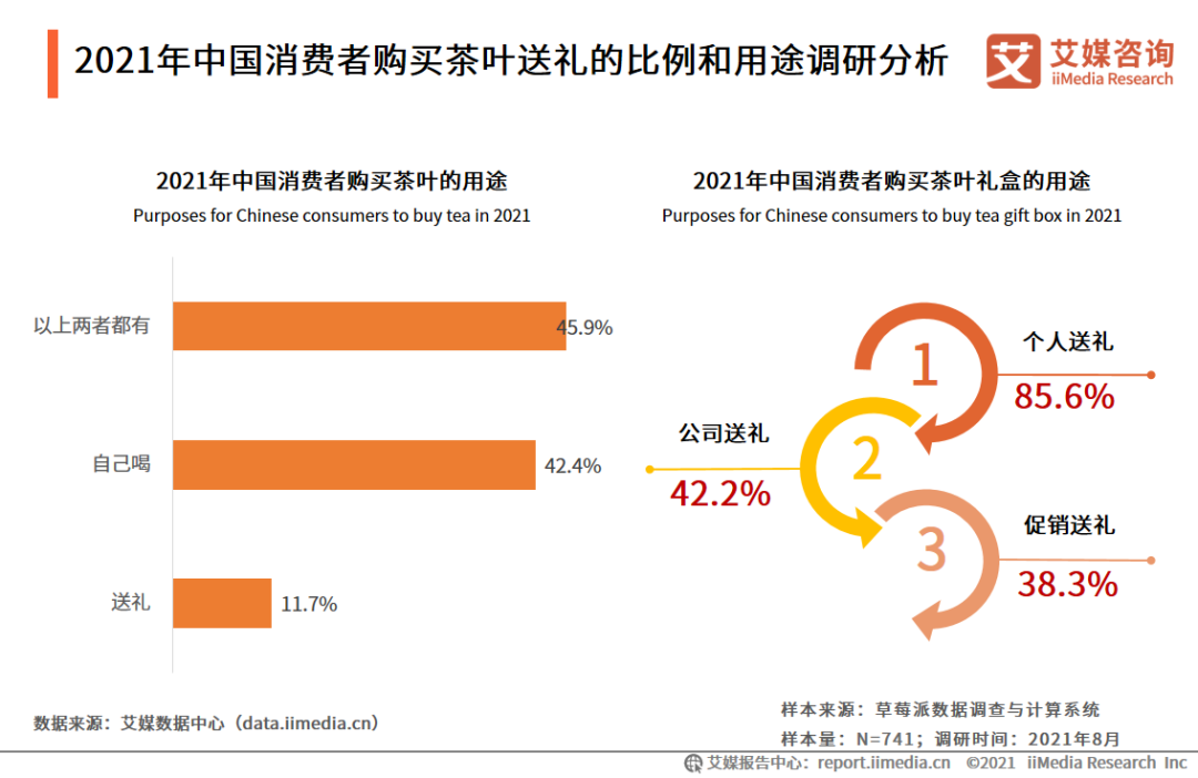iiMedia Research(艾媒咨询)数据显示,大部分消费者购买茶叶礼盒用于送礼,其中个人送礼和公司送礼的比例分别达到85.6%和42.2%。艾媒咨询分析师认为,针对顾客的口味、年龄等给顾客选取性价比较高的茶叶,搭配不同的茶叶礼盒,同时配合 “生态”“绿色”的健康品牌,正在成为市场的新宠。