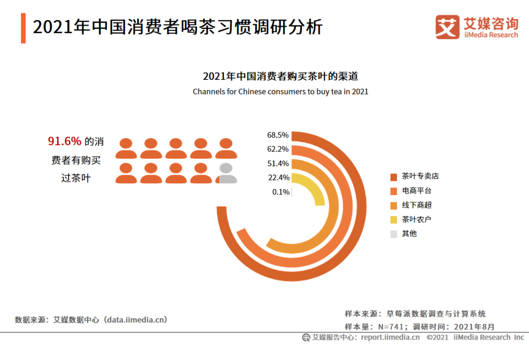 iiMedia Research(艾媒咨询)数据显示,超九成的消费者有购买茶叶的经历,其中选择茶叶专卖店和选择电商平台购买的消费者占比差别不大,分别为68.5%和62.2.%。艾媒咨询分析师认为,国内茶庄、茶行普遍存在并且个别拥有悠久的历史,线下门店提供现场冲泡茶叶服务,借助专业的泡茶技术将茶叶的韵味完全展现出来,通过茶饮的品尝更容易打动消费者,随着电商平台的发展,线下购茶的优势依然存在。
