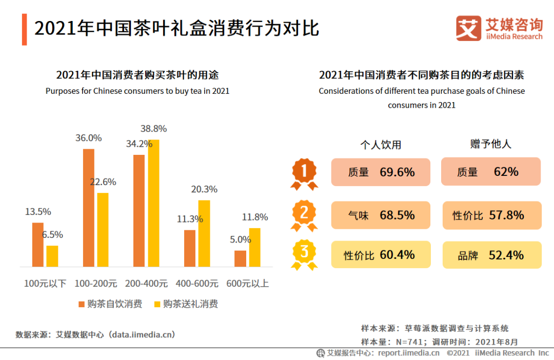 iiMedia Research(艾媒咨询)数据显示,七成的消费者愿意花费100-400元购买茶叶用于自己饮用,八成的消费者愿意花费100-600元购茶用于送礼,两种购茶目的在购买时所考虑的因素中,质量因素都位列第一,分别达到69.6%、62%。艾媒咨询分析师认为,消费者对用于自用的茶叶更注重茶叶本身,对用于送礼的价位整体更高,同时也注重茶叶的品牌、包装等附加价值。
