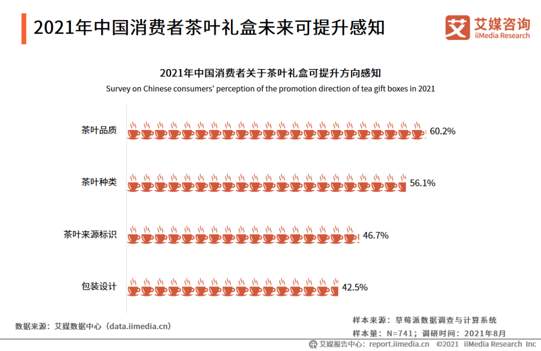 iiMedia Research(艾媒咨询)数据显示,有60.2%的消费者最希望提升茶叶礼盒的茶叶品质,其次是茶叶的种类。艾媒咨询分析师认为,目前茶叶礼盒商家的重心放在包装外观上,而忽略了茶叶的品质,中国茶文化影响广且深远,中国消费者对于茶叶品质有着较高的要求。