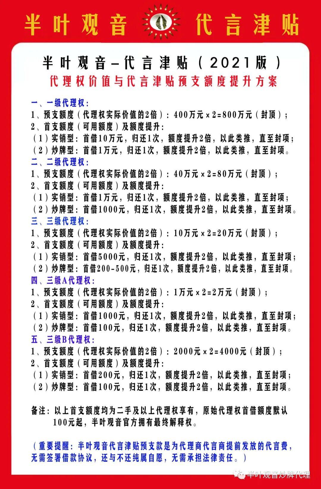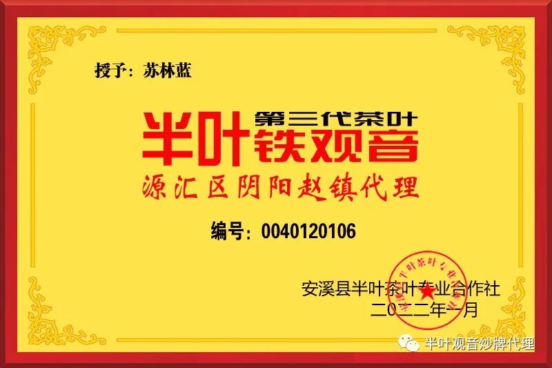 半叶观音官方茶企安溪县半叶茶叶专业合作社为苏林蓝授权的阴阳赵镇3级A代理铜牌,编号:,可代理销售六大茶类(绿茶白茶黄茶乌龙茶红茶黑茶)第三代茶叶新品-半叶茶,并可用于领取众多保销服务商家的消费补贴,抵押申请预支代言津贴(1个镇级代理权最高申请1000元)和8厘公证互助款