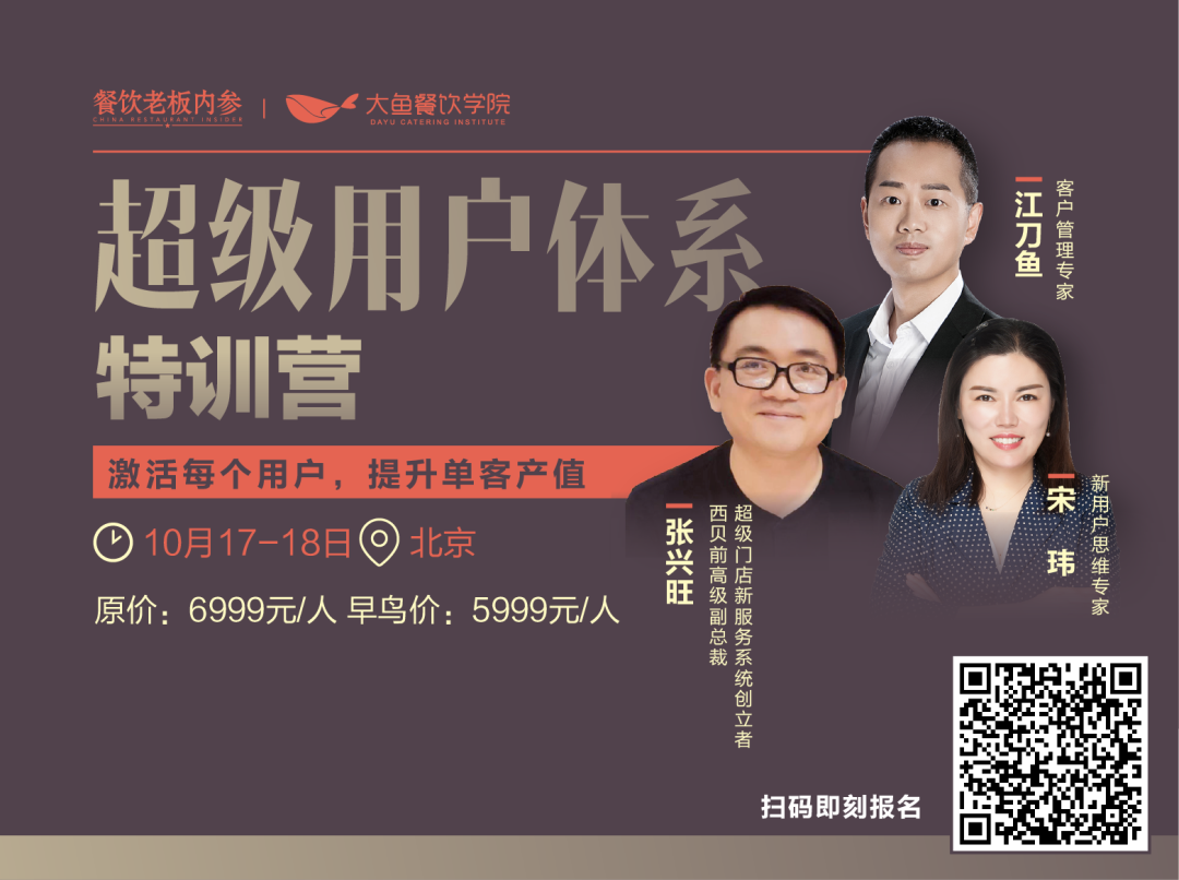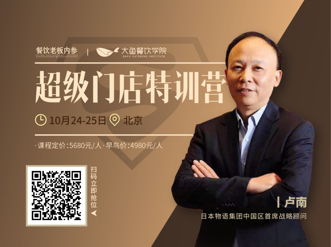 10月24-25日,北京,大鱼餐饮学院联合卢南老师继续推出《超级门店实战营》课程第8期,从精细化运营的底层逻辑出发,深度解析提高门店营业额,以及“人效”、“平效”的实战方法。欢迎大家扫码占座!课程咨询:小餐君(同号)