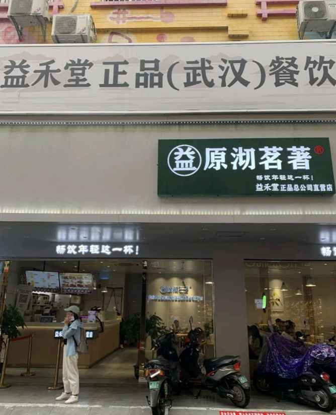 这家公司,把益禾堂的一个产品系列“原沏茗作”,稍加修改注册了商标,使用和益禾堂一样的品牌色调,还加了个大大的“益”字,逼真的视觉冲击力+合情合理的延伸,像极了益禾堂的“子品牌”。