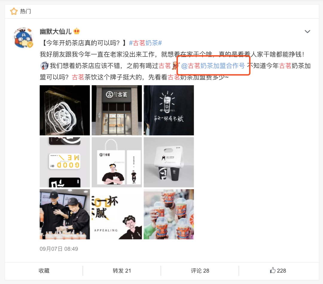 今年出现了很多营销号,不仅粉丝数量都有好几万,而且还会做内容,故事写得声情并茂,然后@古茗奶茶加盟中心,通过有吸引力的内容,给账号引流。
