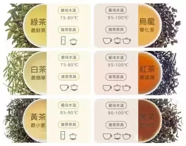 绿茶种类最繁多,抢鲜喝上一杯春茶在古代是皇帝也要附庸的风雅。如:龙井茶、碧螺春、六安瓜片等;红茶是位富有魅力的小姐姐,可高贵可亲民,如今红遍了全世界。如:滇红、祁门红茶、正山小种;黄茶像不出世的高人,据说爱她的人也很神秘。如:霍山黄芽、君山银针;乌龙茶最考验工夫,完美诠释了中国人对食物的耐心和讲究。如:凤凰单丛、东方美人、武夷岩茶;白茶单纯干净,如福鼎白茶、月光白等;黑茶越陈越香,如安化黑茶、普洱熟茶等。