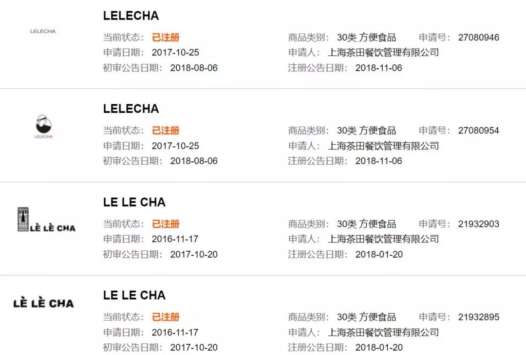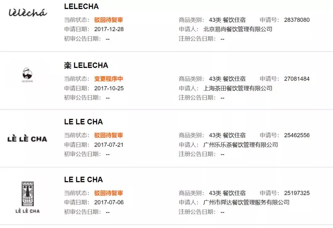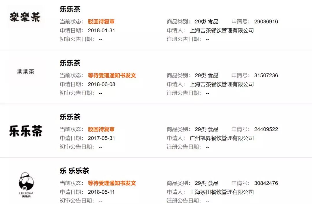 从上图可以看出,有多家公司在抢注“乐乐茶”相关商标。