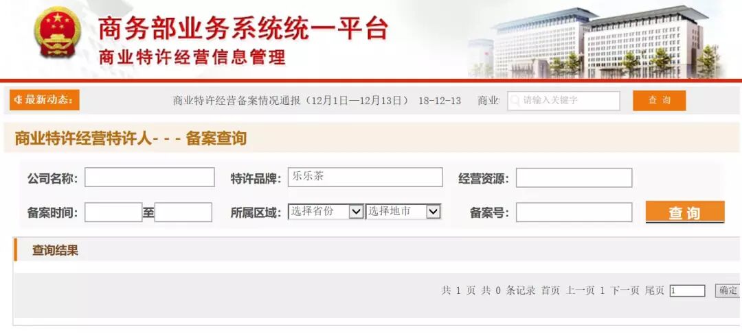 以“乐乐茶”、“lelecha”、“楽楽茶”为关键词在商务部特许经营管理系统中查询这个品牌是否进行过备案。