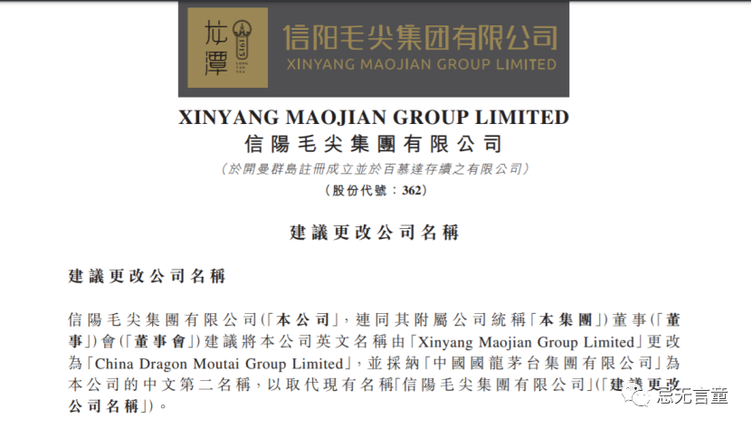 2021年2月16日,信阳毛尖集团有限公司(股票简称:信阳毛尖;股票代码:00362.HK)发布《建议更改公司名称》的公告,称其董事会建议将公司的英文名称从“Xinyang Maojian Group Limited”改为“China Dragon Moutai Group Limited”,并采纳“中国国龙茅台集团有限公司”为其中文第二名称,以取代现有名称信阳毛尖集团有限公司的名称。