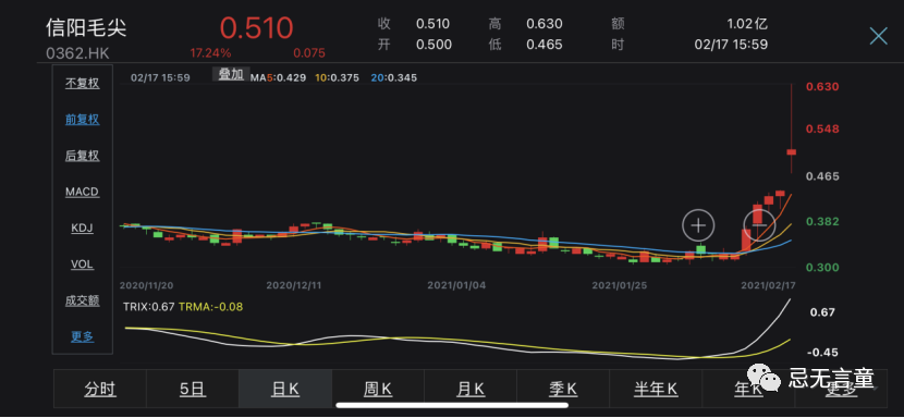 截止笔者查询时,尚未见贵州茅台的公告与毛尖有关,倒是信阳毛尖被追捧,股价涨势如下图: