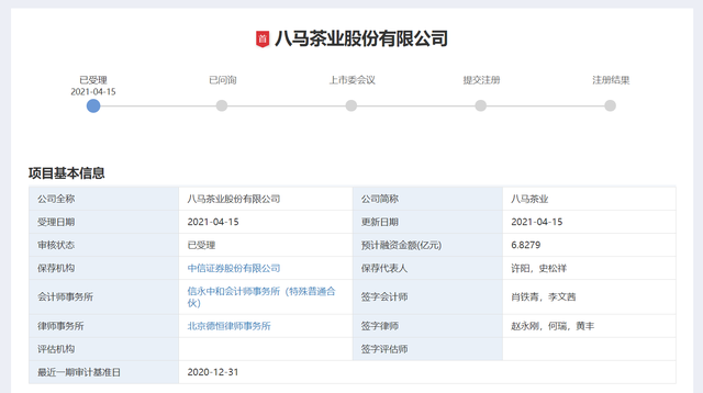 冲击A股“茶企第一股”的路上,再加一位选手。4月15日,全茶类连锁品牌八马茶业股份有限公司(简称“八马茶业”)创业板上市申请已获深交所受理。加上去年的中茶股份、澜沧古茶,目前A股市场等待上市的茶企增加到3家。