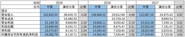 根据两家公司招股说明书中“合并利润表主要数据”显示,报告期的2017-2019年度,中茶公司分别实现营业收入12.29亿元、14.90亿元和16.28亿元,净利润分别为1.81亿元、1.45亿元和1.66亿元;澜沧古茶则分别实现营业收入2.50亿元、3.00亿元和3.80亿元,净利润分别为0.59亿元、0.76亿元和0.81亿元。