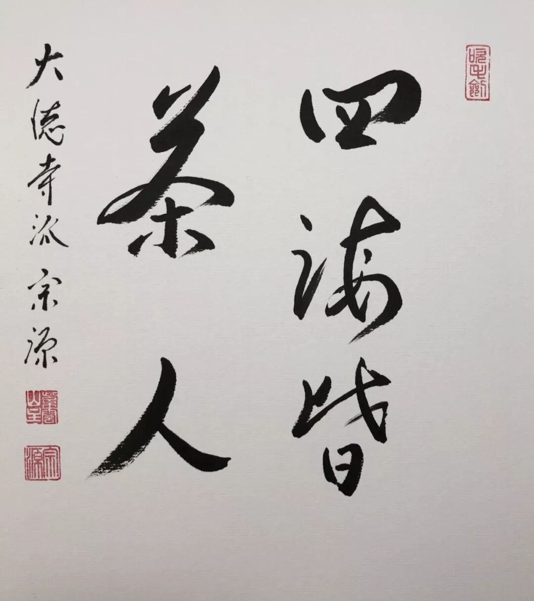 《论语 • 颜渊》:“君子敬而无失,与人恭而有礼,四海之内皆兄弟 也!君子何患乎无兄弟也。”由此引申出“四海皆茶人”之句,表示四海无人非茶人,喝茶无人不兄弟,以此希望即使是仇人也可以化干戈为玉帛。图 56 为大德寺派僧人前田宗源墨迹,其昭和七年(1932)生于 京都,同志社大学经济学部毕业,曾在建仁寺任职,并在大德寺瑞光院住职。