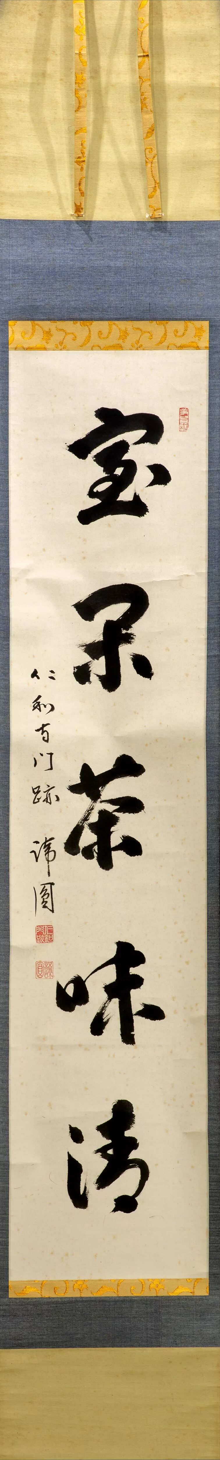 “室闲茶味清”是日本茶道中常用挂轴内容,描述人在无事状态下,没有外来压力与干扰,专注当下地品尝一杯好茶,才能真正品尝到茶味的清香与清澈。图 50 为森谛圆(1901 - 1990)墨迹。 其为真言宗僧人,明治三十四年 (1901) 生于香川县,任总本山仁 和寺第四十一世门迹,总部仁和寺属佛教皇族住持,御室派花道 总裁。森谛圆八岁进入佛门,于 种智院大学毕业,著有《对孩子的说话方式》等书。