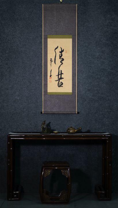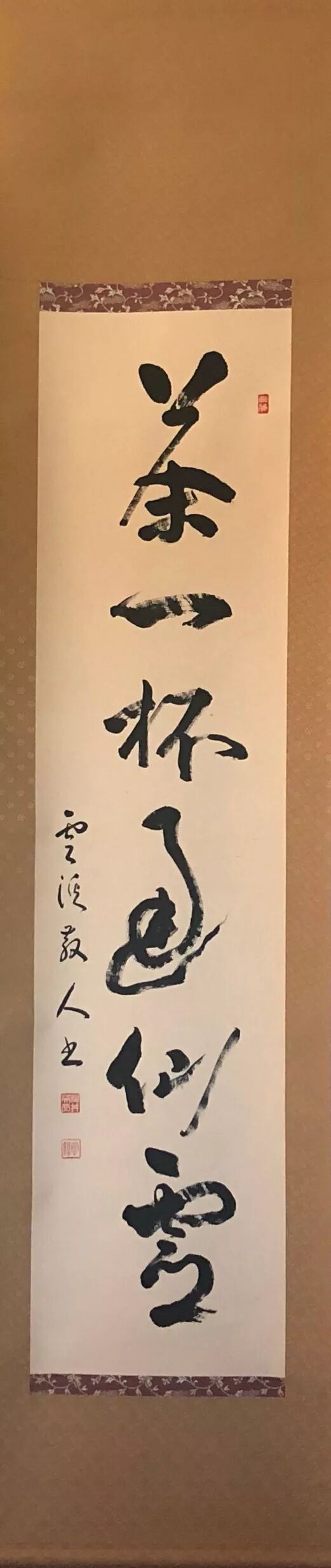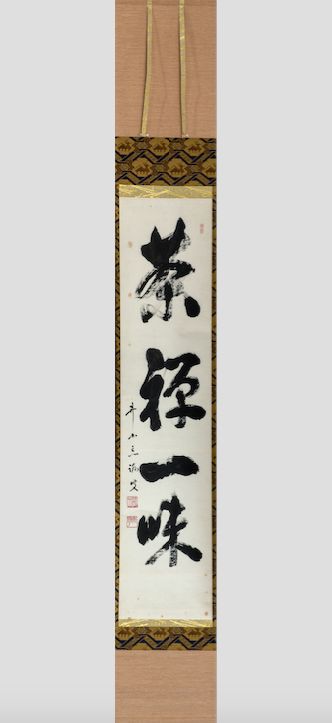 茶道挂轴,是指特别用于茶事活动中,与吃茶本身直接相关,或出现茶字的相关挂轴。日本茶道四谛 :“和敬清寂”、“一期一会”等就是在茶道过程中出现的专用词句,而“吃茶去”、“禅茶一味”等,就是直接出现了茶字的挂轴,在茶道新人悬挂茶挂时,比较喜欢选用这样的茶挂内容,它们也是刚开始收藏茶挂的人们所喜爱的内容。