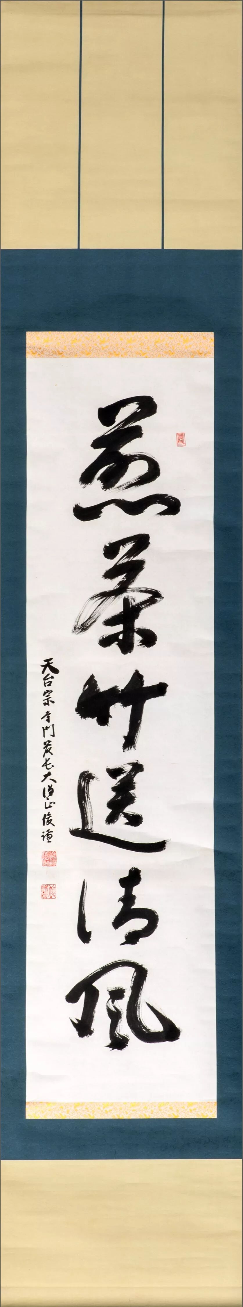 唐代卢仝《走笔谢孟谏议寄新茶》中写道,七碗茶下肚后 :“玉川子,乘此清风欲归去。”唐代孟浩然《听郑五愔弹琴》诗句中有 :“阮籍推名饮,清风坐竹林。”“煎茶竹送清风”正是描写煎茶吃茶之后的心境, 一派怡然自得、逍遥自在的神态。图 49 为天台宗三井寺 ( 园城寺 ) 管长、大僧正大 风俊谦墨迹。