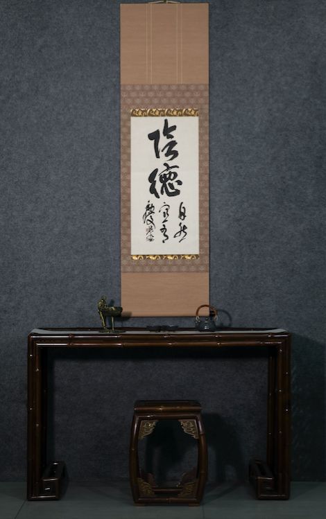 日本也有专用花道空间(花室)和香道空间(香室),在这些空间的壁龛中同样会悬挂书画挂轴,但它们并没有获得“花挂”或“香挂”的名称,通常也是以“茶挂”称之,或只能称为“挂 轴”。日本茶挂以禅语为多,但也不限于此,为方便雅道爱好者阅读,本章以茶道、花道、香道分节,便于查询。