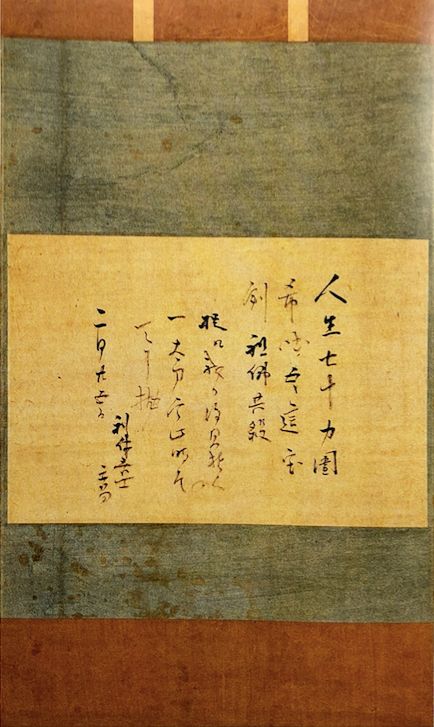 日本茶道表千家藏有一件千利休珍贵的茶 挂,也是千利休遗偈(图 57),或被称为千利休 的绝命词 :“人生七十, 力图希咄。吾这宝剑, 祖佛 共 杀 。”“ 希 咄 ”, 之前这个词在汉语中没有,用“图”表达只是 一种近似借用,本意指船出发时发出的威势十 足的声音。“希”是“唏” 的意思,表达悲愤情怀;“咄”表示叱咤之声, 大声斥骂,即表达千利休已经送走了人生七十 年漫长的路程,如今却站在生死岸边,什么也没有。千利休快七十岁 时,被丰臣秀吉命剖腹自杀,于是千利休写下 了这句话。其中“祖佛共杀”是《临济录》中的名言 :“ 欲得如法见解, 但莫受人惑。向里向外 , 逢着便杀 : 逢佛杀佛,逢祖杀祖,逢罗汉杀罗汉,逢父母杀父母,逢亲眷杀亲眷,始得解脱,不与物拘,透脱自在。”千利休本名千宗易,后来易名“利休”,一位禅师如是解释:“利”是“锋利”的意思,而“利休”,便是收敛锋芒。 但是他的锋芒终究不能隐匿,死时的茶圣,只能以宝剑自况。如今,表千家挂出这件茶挂时,更能彰显其嫡传正宗的地位。