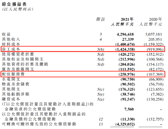 据奈雪的茶年报披露数据显示,2021年公司员工成本为14.24亿元,占总收益的33.2%,而2020年则为9.19亿元,占总收益的30.1%;配送服务费达2.59亿元,占全年总收益的6%,而2020年为1.67亿元,占当年收益的5.5%。