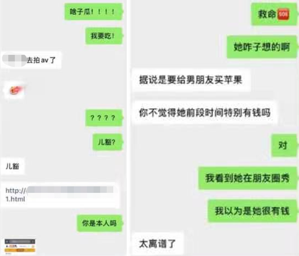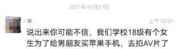 有人说,毁掉一个人最快的方式就是让他赚快钱。但即便如此,还是有不少人前仆后继的想乘上这艘快船。甚至还有些年轻人,为此断送了自己的大好前程。最近,网上就爆出了一段聊天记录,让人大跌眼镜。女大学生去拍三级片,就为了给男朋友买苹果?▷ 北京保姆揭露男足逆天奢华生活,豪车嫩模照曝光:“纵欲过度,不废才怪”