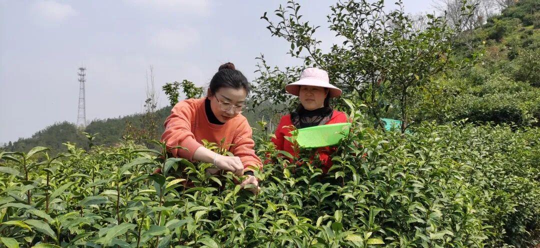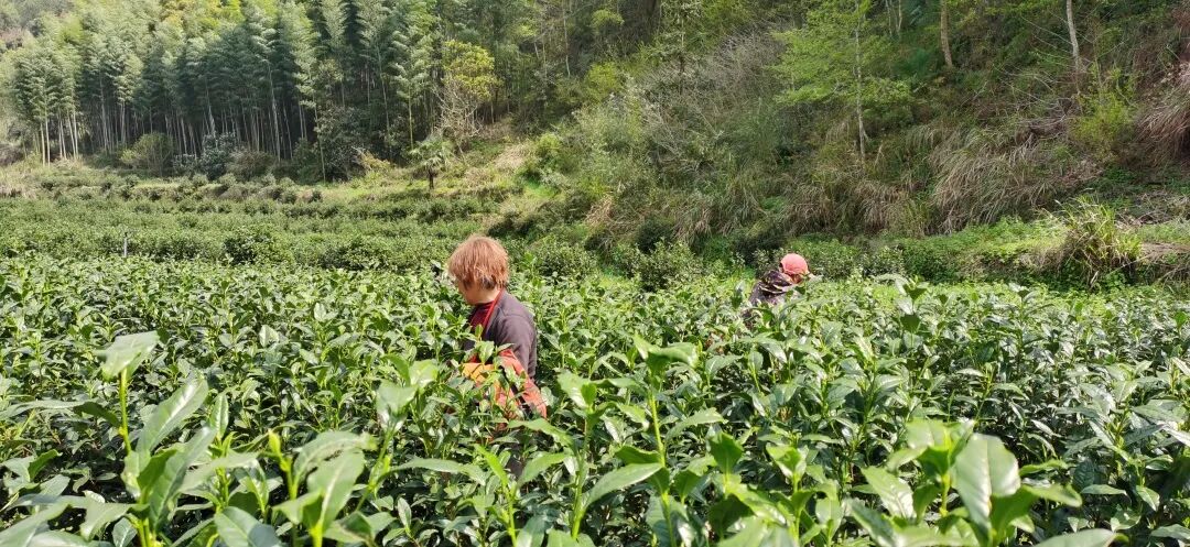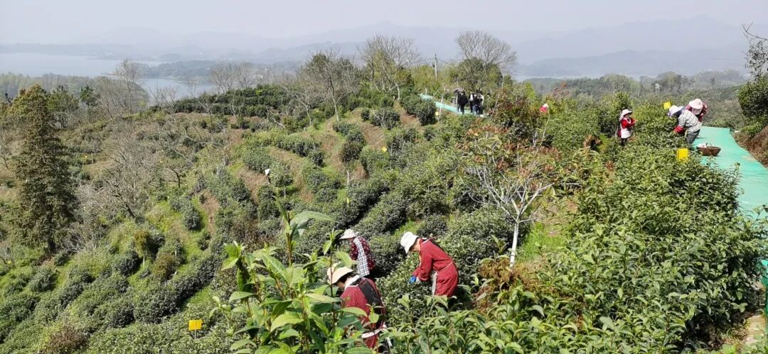 当下正是春茶上市季,在寺前镇洪畈村初心产业园,一株株茶树长出一片片新芽,翠绿一片,采茶的村民散落在茶园之间,手法娴熟地采摘新茶。