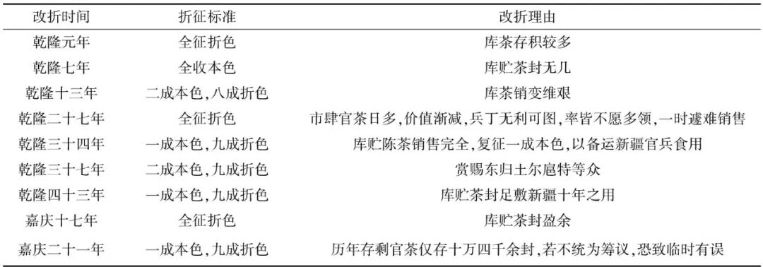 资料来源:杨应琚:《酌筹甘省茶政疏》,《皇清奏议》卷53,《续修四库全书》第473册,上海:上海古籍出版社,2002年,第453-454页;吴达善:《为酌请仍复商交二成本色官茶事》,乾隆三十六年八月二十七日,军机处档折件,文献编号:,台北故宫博物院藏;勒尔谨:《为酌请改征茶封以免壅积事》,乾隆四十二年三月初九日,宫中档奏折(乾隆朝),文献编号:,台北故宫博物院藏;祁寯藻等:《为遵旨察核甘省道光三十年茶马奏销事》,咸丰四年闰七月十四日,户科题本,档案号:02-01-04-21538-008,中国第一历史档案馆藏。