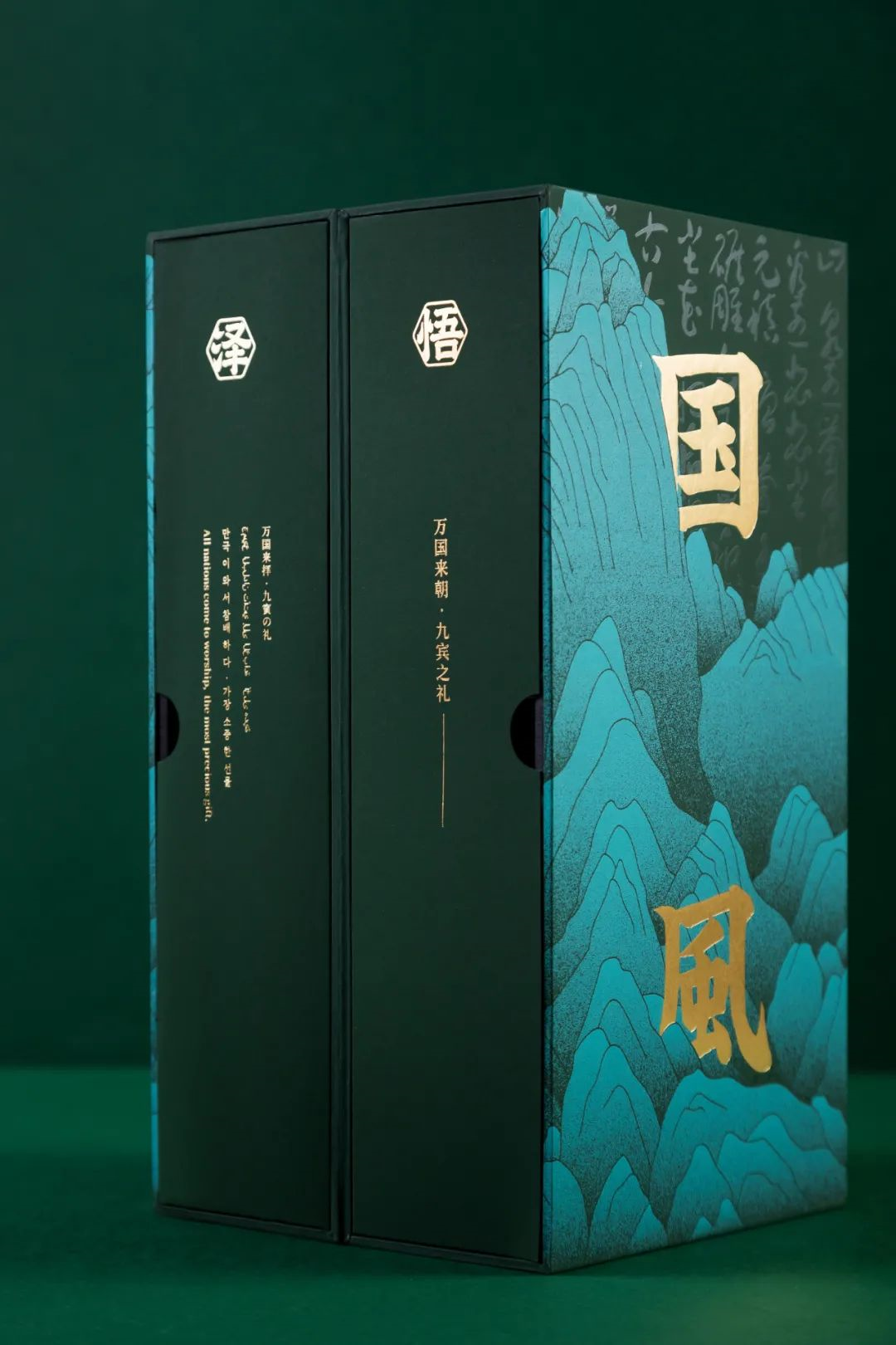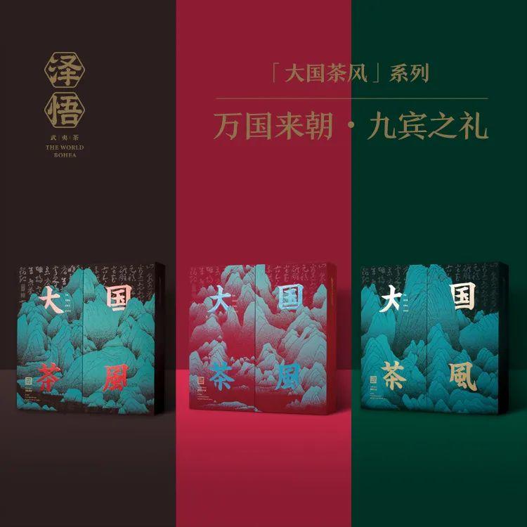 大国盛世,以茶为礼,饮茶成风。大国茶风系列传达的便是泽悟对中华及中华五千年之文化传承的致敬。在茶包装设计上,节选了北宋名画《千里江山图》,让茶友观赏到大国江山的壮美秀丽,内书五国语言的“万国来朝,九宾之礼”,展示大国之恢弘气度与包容。