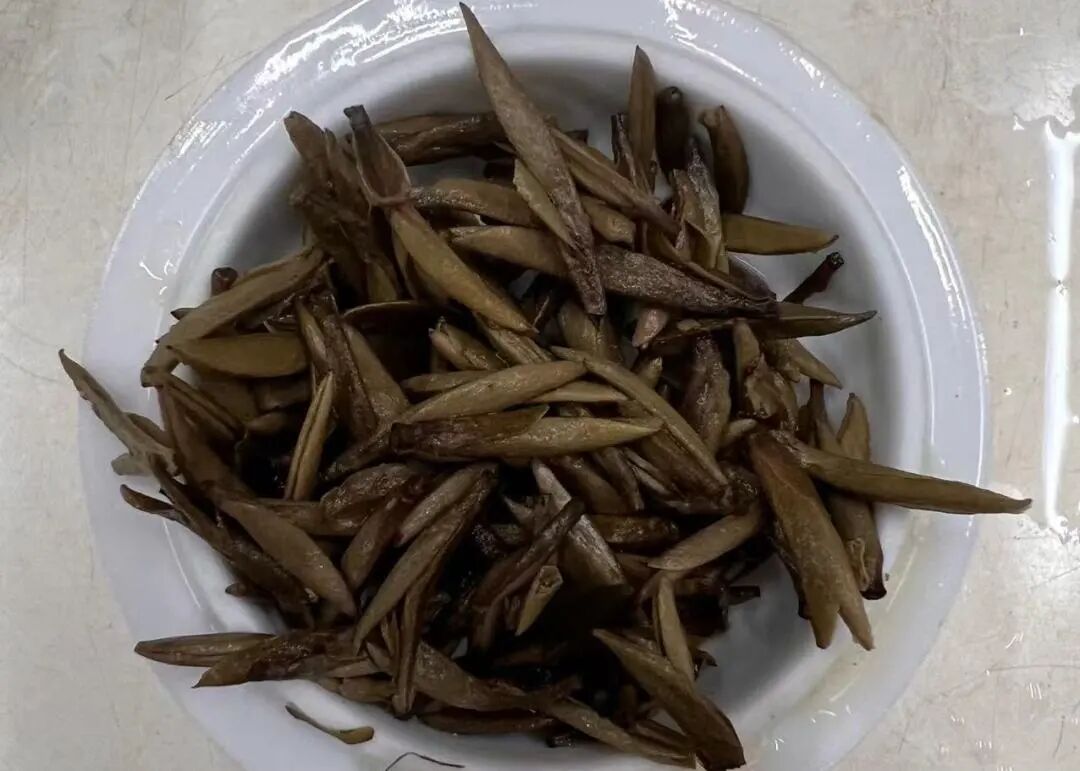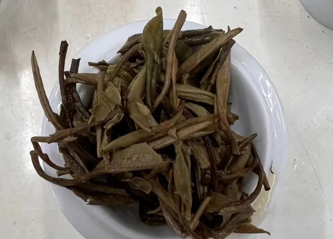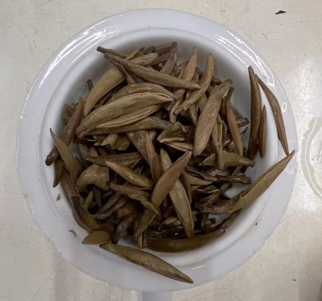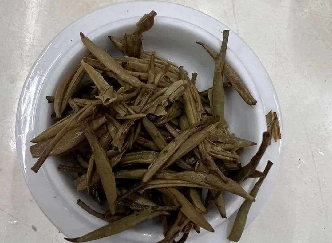 这款银针的话,整个而言,芽头会偏瘦长,色泽青绿,茶汤会青涩,苦尾。在制作的过程中,萎凋不足导致的。
